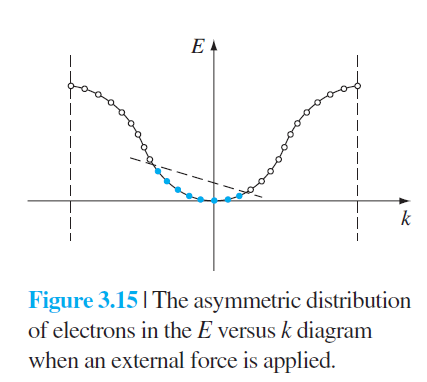 즉, 외력(F)에 의해 에너지를 얻은 전자들은 E(Energy)와 K(Momentum) 모두 증가해 위의 Figure 3.15처럼 분포하게 됩니다.