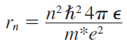 식 (4.27)과 식 (4.28)을 rn에 대해 정리하면 다음과 같이 보어의 원자 모형에 대한 반지름을 구할 수 있습니다.