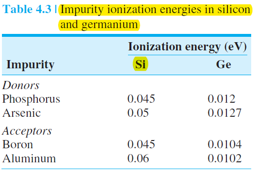 Table 4.3을 보시면, 실리콘(Si) 보다 저마늄(Ge)의 경우, 도펀트 이온의 이온화 에너지가 더 작은 것을 확인할 수 있습니다.
