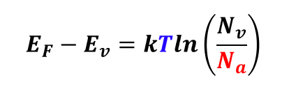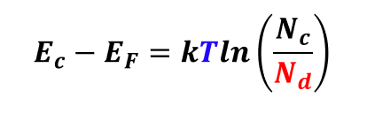 결과적으로, 페르미 에너지 준위(EF)의 위치는 온도와 도펀트 원자의 농도에 의해 결정되는 것을 알 수 있습니다.