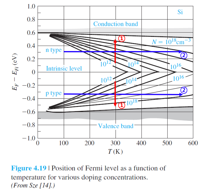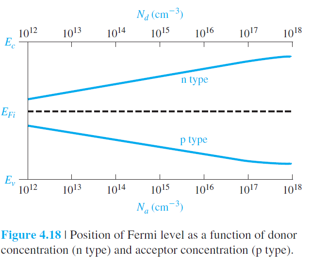 이 경우, 페르미 에너지 준위(EF)는 진성 페르미 에너지 준위(EFi) 대비 증가하게 되고,