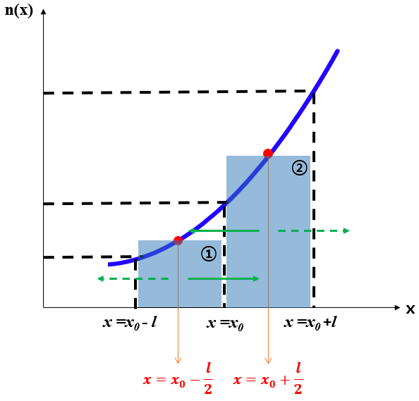 ① 영역의 전자의 농도(n(x)) 중 절반은 왼쪽(초록색 점선), 절반은 오른쪽(초록색 실선)으로 움직인다고 하고,