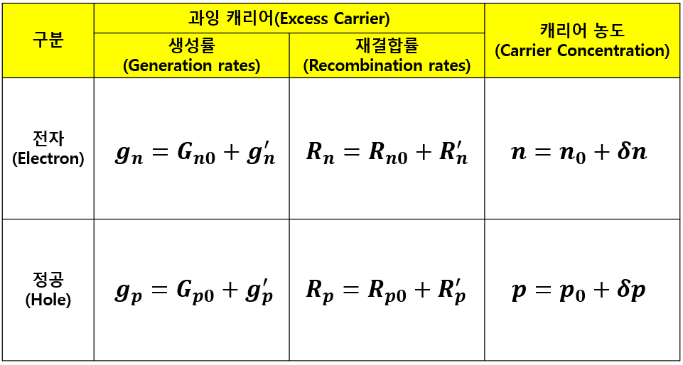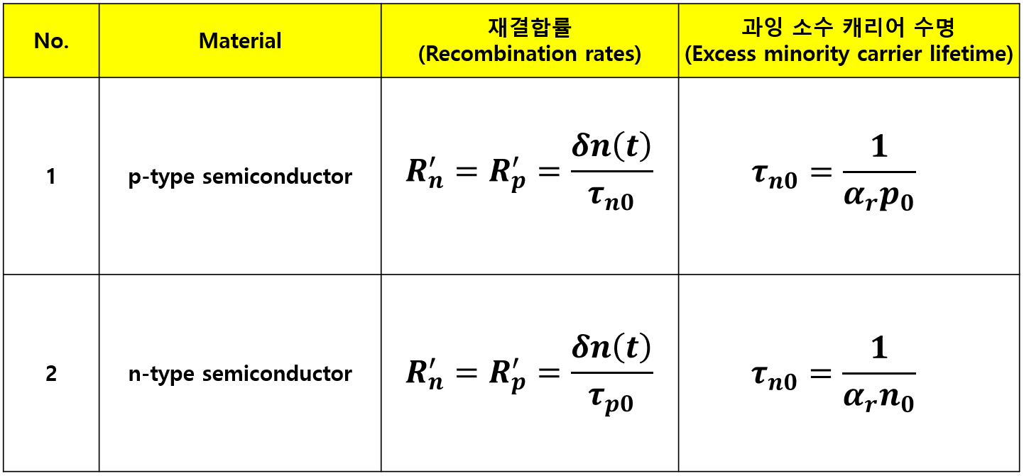 즉, 재결합률(Recombination rate)은 과잉 소수 캐리어의 농도와 수명(lifetime)에 의해 결정되는 것을 알 수 있습니다.