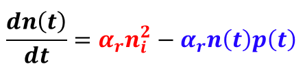 다른 요소를 제외하고 생성(Generation)과 재결합(Recombination)만 고려하면 전자의 농도 변화는 다음과 같습니다.