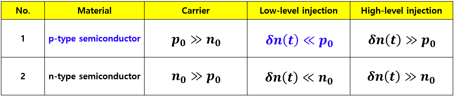 주어진 미분 방정식을 풀기 위해, p-type semiconductor이고, 저준위주입(Low-level injection)이라 가정하겠습니다.