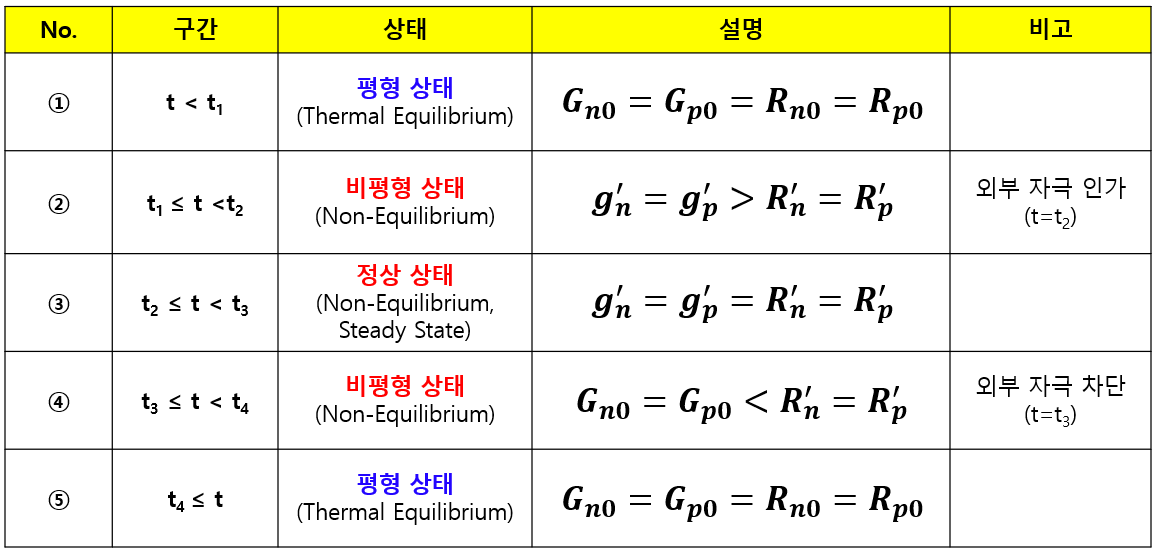 과잉 캐리어(Excess Carrier)는 더 이상 증가하지 않는 상태이며, g'n=g'p=R'n=R'p를 만족합니다.