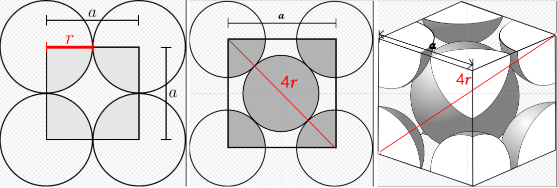 단순 입방체는 2r = a, 체심 입방체는 4r = sqrt(3)*a, 면심 입방체는 4r=sqrt(2)*a입니다.