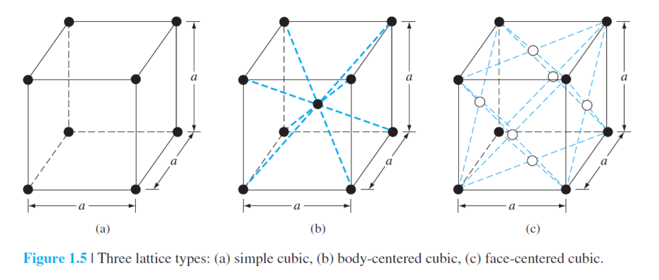 (a)는 단순 입방체(Simple Cubic), (b)는 체심 입방체(Body-Centered Cubic), (c)는 면심 입방체(Face-Centered Cubic)이라고 합니다. 줄여서 SC, BCC, FCC라고 부릅니다. 나머지 한 가지 경우는 다이아몬드 구조의 경우인데, 이는 1.4절에서 다루도록 하겠습니다.