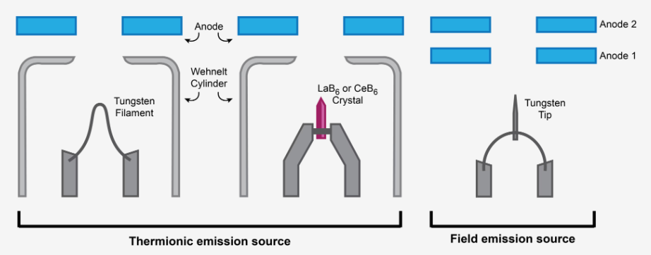 위의 그림처럼, 전자빔 생성 원리에 따라 열전자방출형과 전계방출형(FEG)로 구분되는 것을 확인할 수 있다.