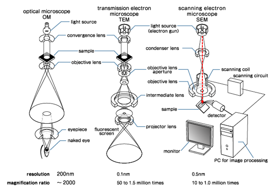 먼저, 전자현미경(Electron Microscope)이란 전자빔을 광원으로 사용하여 고배율, 고분해능의 관찰이 가능한 현미경이다.