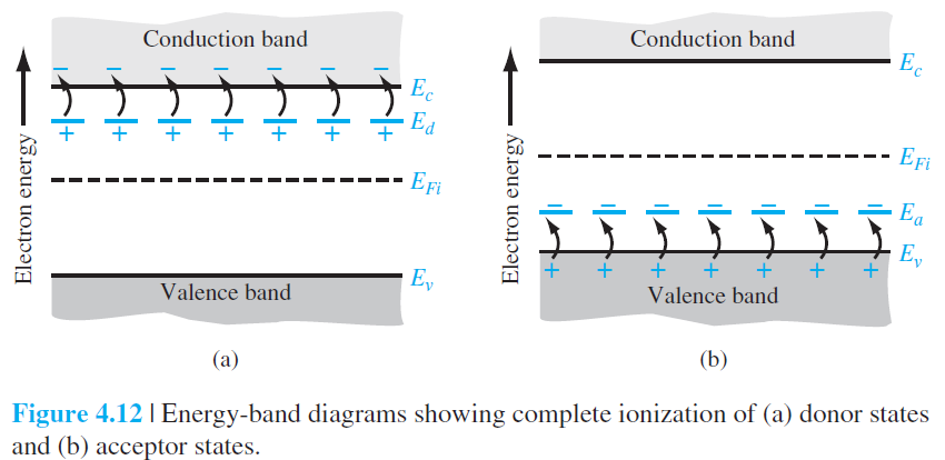 아래의 Figure 4.12는 완전 이온화(Complete ionization)에 대한 에너지 밴드 다이어그램입니다.